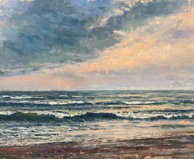 Soft pastels are pure pigments that capture light and energy with vibrancy. Their velvety texture allows me to create translucent layers, building depth in crashing waves or the shimmer of tidal pools. Working outdoors, I respond to the shifting atmosphere and the rhythm of the sea, using skillful mark making for power and fine detail for delicate spray. I do this by varying the pressure of the pastel when applied to my support and by using all the different edges of my pastels. The luminosity of pastel brings water to life, from the thunder of surf against rock to the intimate curl of a wave. Through this medium, I can capture the energy and transparency of water and a moment in time that speaks to me.
