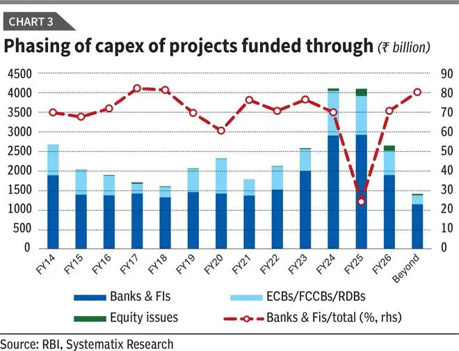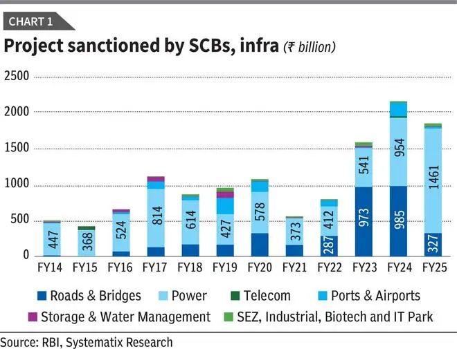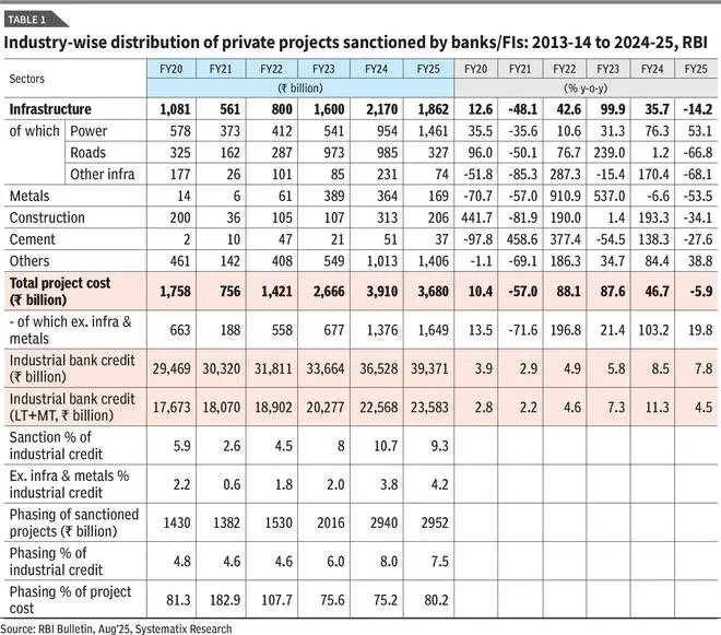 The RBI’s analysis concedes weakness in FY25 but highlights conditions for renewal. Banks and financial institutions sanctioned 907 projects worth ₹3.68 trillion in FY25, a decline from ₹3.91 trillion in FY24 (Table 1). Including external commercial borrowings (₹970 billion) and equity issuances (₹323 billion), the total investment intent reached ₹4.97 trillion across 1,584 projects, about 9 per cent below the previous year. Greenfield infrastructure led the activity, accounting for over 50 per cent of costs, driven by power and roads.