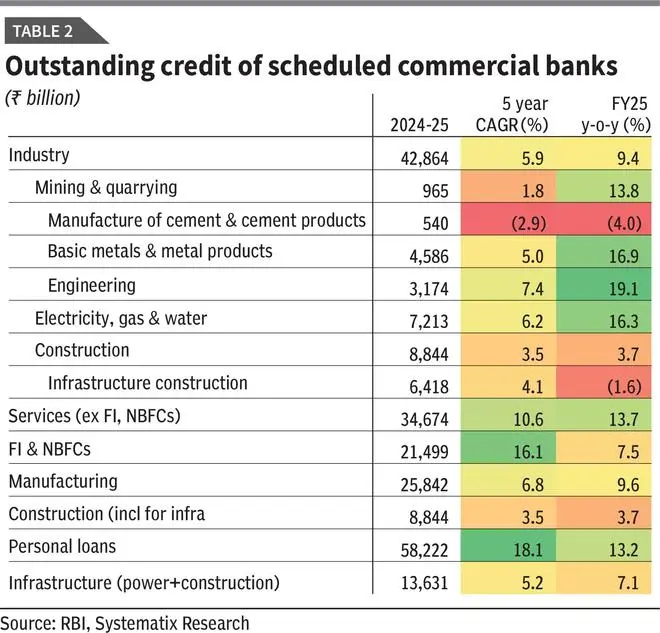 Sectorally, credit flows remain uneven (see Chart 4). Lending to power, metals, and engineering has improved, but infrastructure lending, in contrast to RBI’s project sanction data, grew just 7.1 per cent in FY25. Extending the definition to telecom, airports, railways, ports, and roads, overall infrastructure lending even contracted slightly (-1 per cent YoY) in 1QFY26 — despite a six-year average of only 4.1 per cent growth. Conversely, construction loans rose 10 per cent and other industries by 9 per cent.