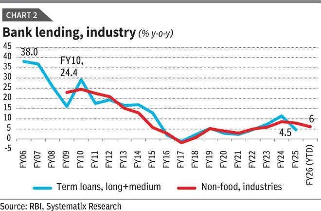 The gap between project sanctions and actual lending further challenges RBI’s optimism (see Charts 1, 2 and 3, and Table 2). Scheduled Commercial Banks’ long- and medium-term lending grew just 4.5 per cent in FY24 and has averaged 6 per cent over five years. Overall industrial credit rose 7.8 per cent in FY25 but slowed to 6 per cent in the first quarter of FY26.