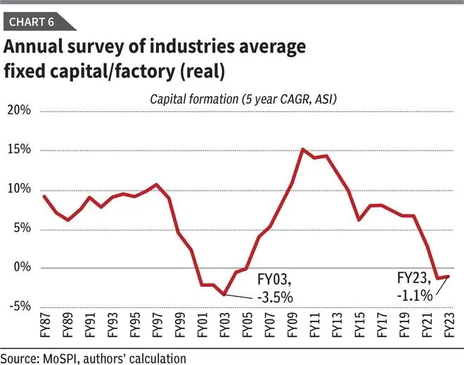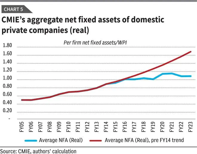 Additional data confirms these concerns. CMIE’s sample of 32,000 companies shows real net fixed capital growth averaging only 1.2 per cent over the past five years. Broader Annual Survey of Industries (ASI) data is even more concerning, showing a 1.1 per cent annual contraction. Corporate fixed assets are now estimated at 36 per cent below the trend line based on a decade-ago trajectory.
