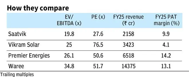 Saatvik reported PAT of ₹214 crore (10 per cent PAT Margin) in FY25 on revenues of ₹2,158 crore. The EBITDA margins improved from 2.4 per cent in FY23 to 13.6 per cent in FY24 on achieving scale and have further increased to 15 per cent in FY25. This has been achieved even as realisation from solar modules have declined from ₹24,500 per watt in FY23 to ₹14,284 per watt in FY25 (24 per cent CAGR decline).